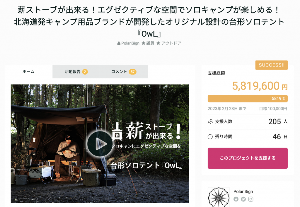 2023.01.16 2023年1月11日よりクラウドファウンディング GREEN FOUNDING にて当社初のオリジナルテント-OwL-を販売開始しました。 2023年1月11日よりクラウドファウンディング GREEN FOUNDING にて当社初のオリジナルテント-OwL-を販売開始しました。 詳しくはこちら ホームページをリニューアルいたしました。 2023年6月3〜4日に開催されるアウトドアデイジャパンに当社のオリ...